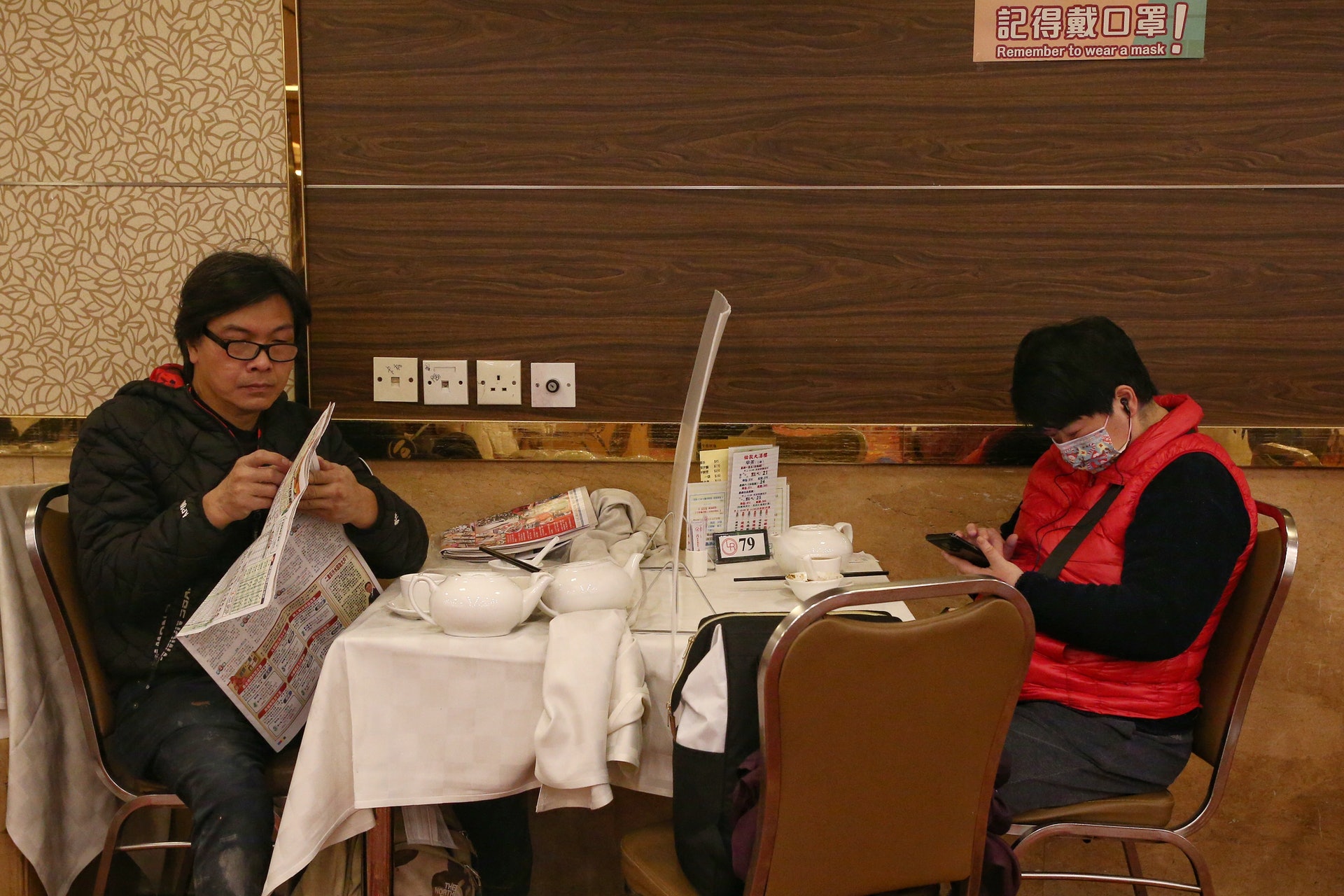 去年受疫情影響,食肆禁止晚市堂食,午市亦只能二人一枱。(張浩維攝)