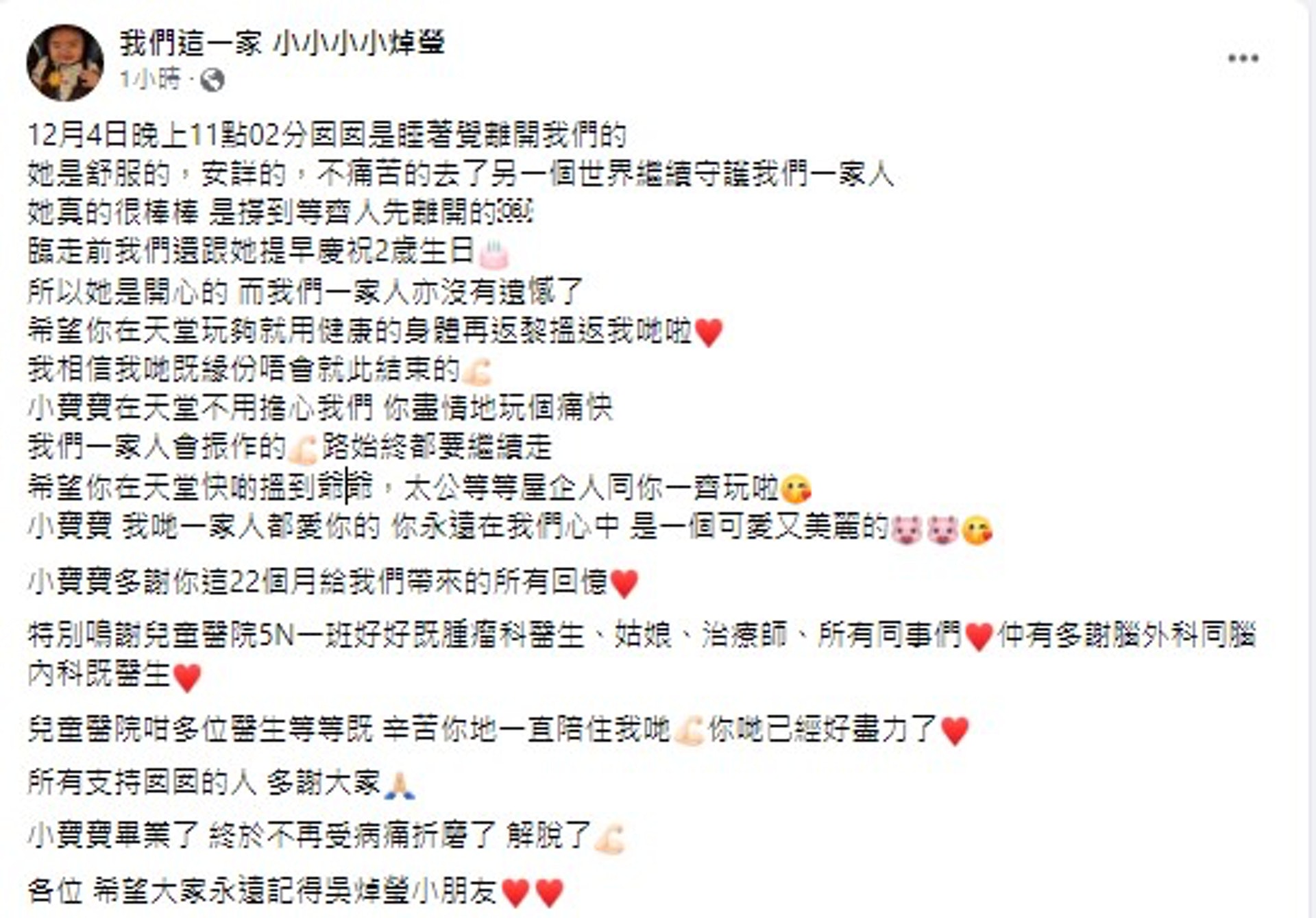 - m5 z3 S! x/ X8 x1 J有「抗癌小戰士」之稱的女嬰焯瑩,昨日(4日)晚上11時許安詳離世。(「我們這一家 小小小小焯瑩」facebook專頁圖片)tvb now,tvbnow,bttvb0 {& U+ D0 `) ^# b