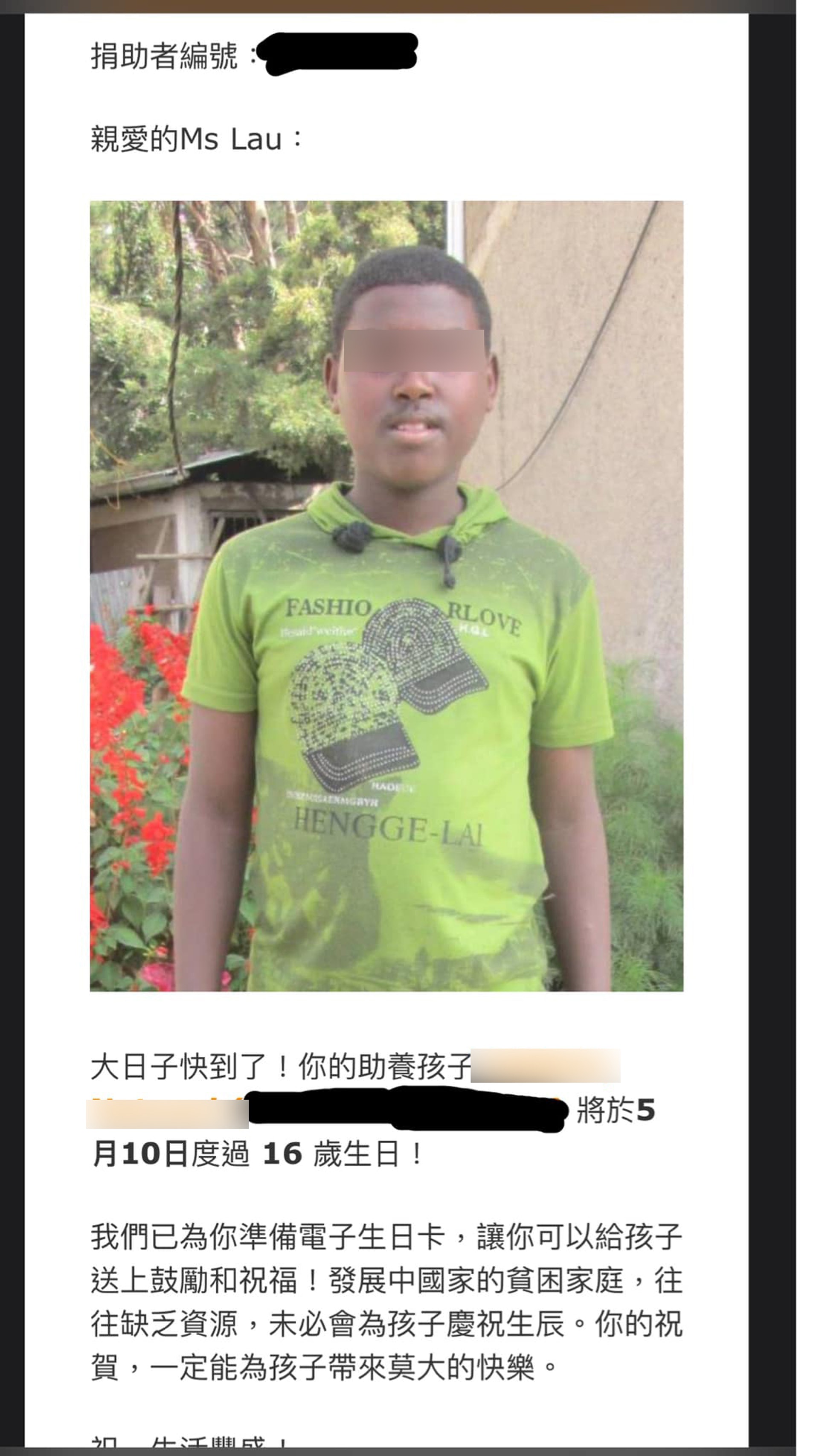 宣明會在受助人16歲生日時,邀請助養人送予電子生日卡,但照片與翌年電郵上的一模一樣。(fb「Ahyo Lau 」圖片)) @3 J: |9 `, k